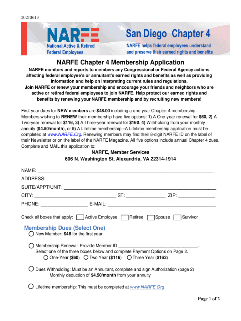 20210613NARFE Chapter 4 Membership Application ARE monitors and reports to members any Congressional or Federal Agency actions affecting federal employees or annuitants earned rights and benefits