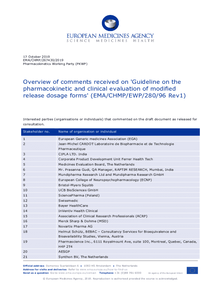 17 October 2019 EMA×CHMP×267430×2019 Pharmacokinetics Working Party (PKP×Overview of comments received on \'Guideline on the pharmacokinetic and clinical evaluation of modified release dosage