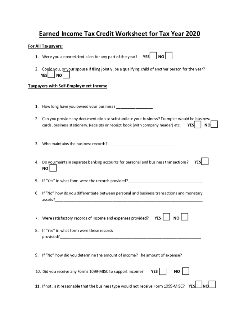 Earned Income Tax Credit Worksheet for Tax Year 2020 For All Taxpayers: 1. Were you a nonresident alien for any part of the year?YESNO2. Could you, or your spouse if filing jointly, be a qualifying