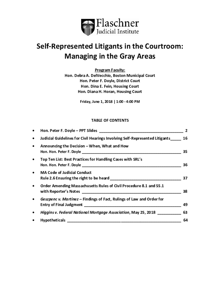 SelfRepresented Litigants in the Courtroom: Managing in the Gray Areas Program Faculty: Hon. Debra A. DelVecchio, Boston Municipal Court Hon. Peter F. Doyle, District Court Hon. Dina E. Fan, Housing