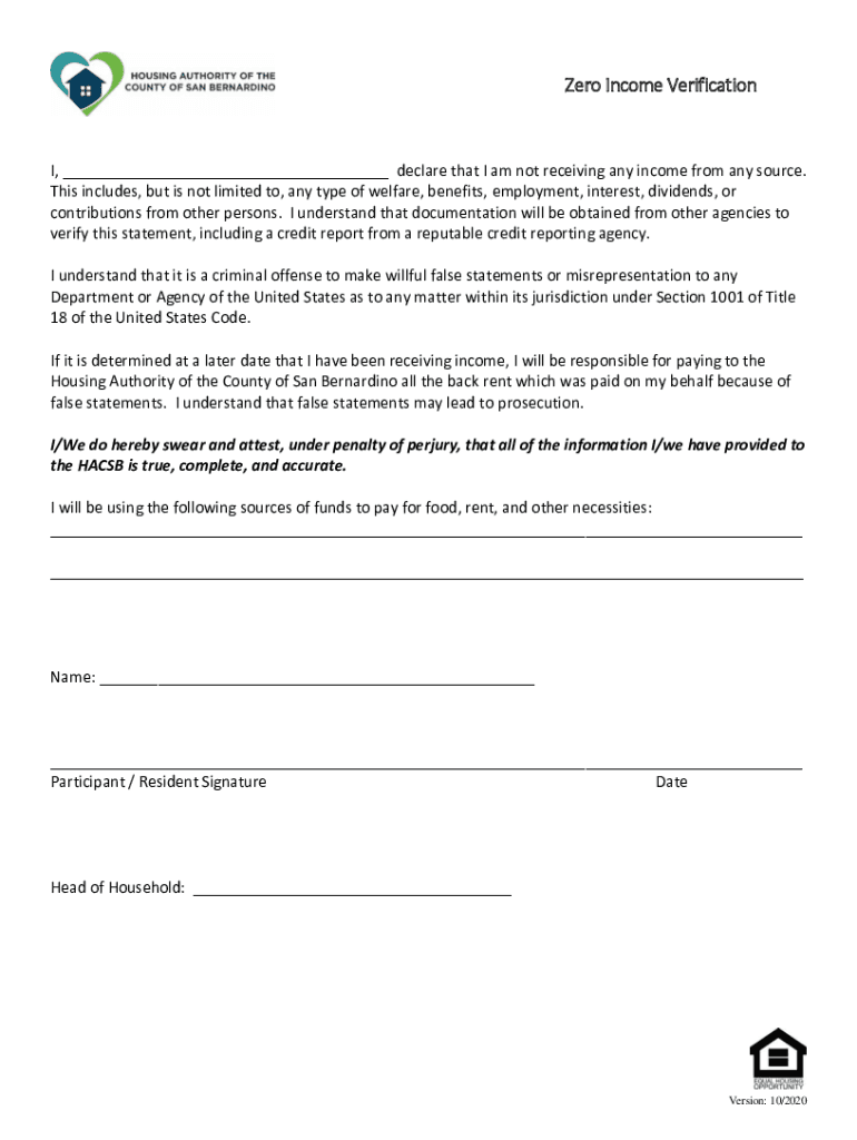 Zero Income Verification, ___ declare that I am not receiving any income from any source. This includes, but is not limited to, any type of welfare, benefits, employment, interest, dividends, or contributions