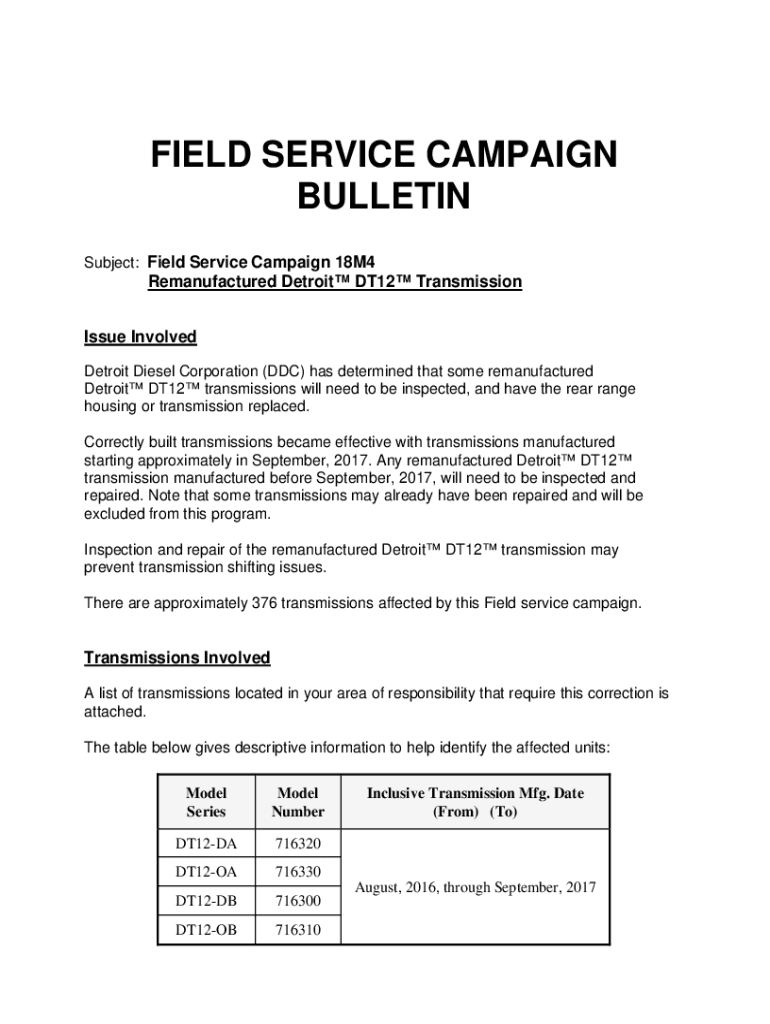 FIELD SERVICE CAMPAIGN BULLETIN Subject: Field Service Campaign 18M4Remanufactured Detroit DT12 Transmission Issue Involved Detroit Diesel Corporation (DDC) has determined that some remanufactured