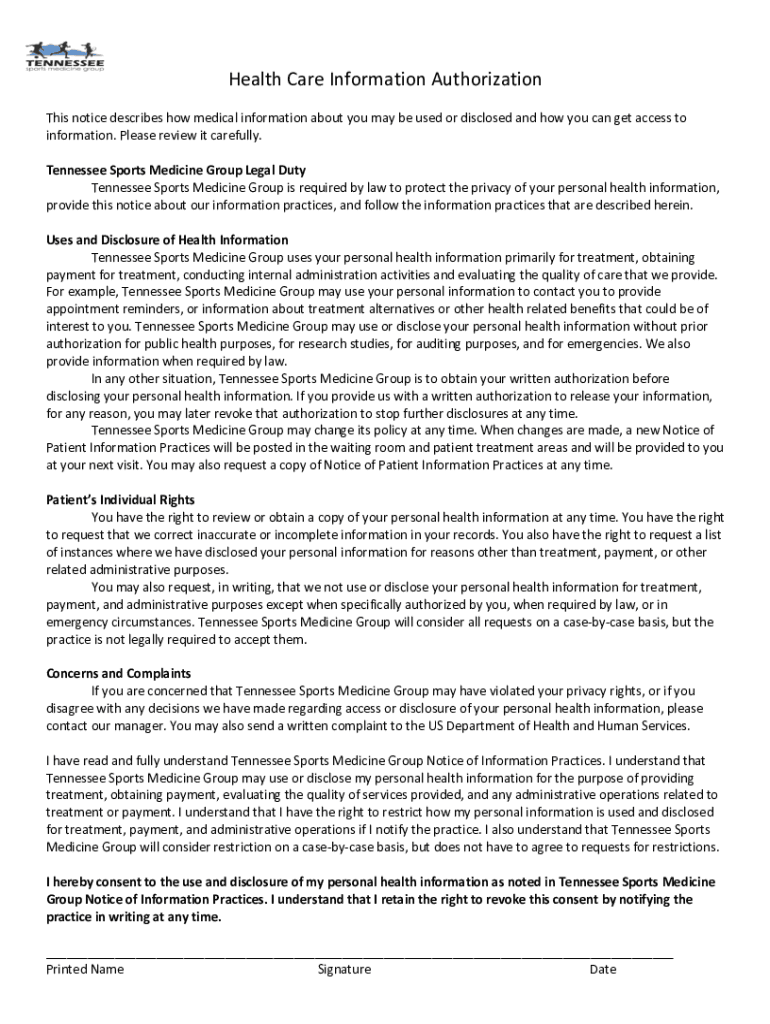 Health Care Information Authorization This notice describes how medical information about you may be used or disclosed and how you can get access to information. Please review it carefully. Tennessee