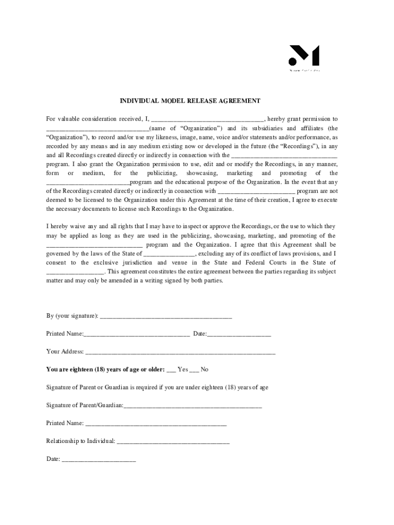 INDIVIDUAL MODEL RELEASE AGREEMENT For valuable consideration received, I, ___, hereby grant permission to ___(name of Organization) and its subsidiaries and affiliates (the Organization×, to record