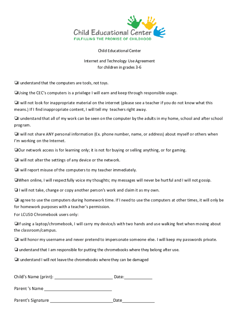 Child Educational Center Internet and Technology Use Agreement for children in grades 36 I understand that the computers are tools, not toys. Using the CCS computers is a privilege I will earn and