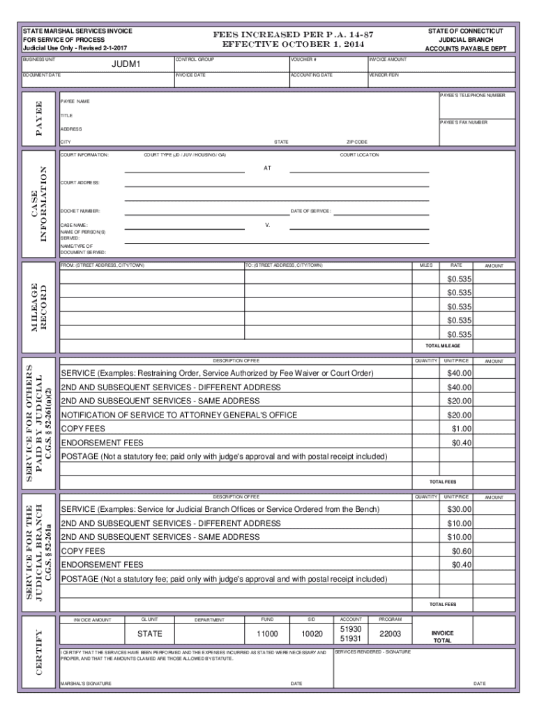 STATE MARSHAL SERVICES INVOICE FOR SERVICE OF PROCESS Judicial Use Only Revised 212017 BUSINESS INITIATE OF CONNECTICUT JUDICIAL BRANCH ACCOUNTS PAYABLE Degrees Increased Per P.A. 1487 Effective October