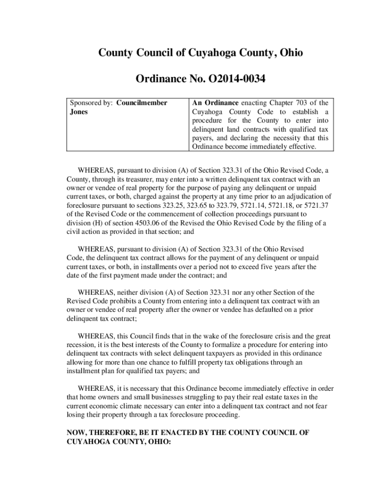 County Council of Cuyahoga County, Ohio Ordinance No. O20140034 Sponsored by: Council member Jones Ordinance enacting Chapter 703 of the Cuyahoga County Code to establish a procedure for the County