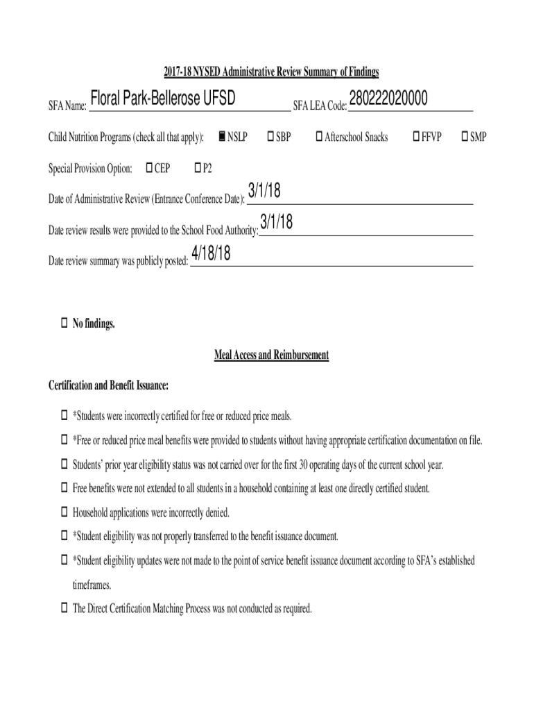 201718 NOSED Administrative Review Summary of FindingsFloral ParkBellerose FSD 280222020000 SFA Name: ___ SFA LEA Code: ___ Child Nutrition Programs (check all that apply): Special Provision Option: