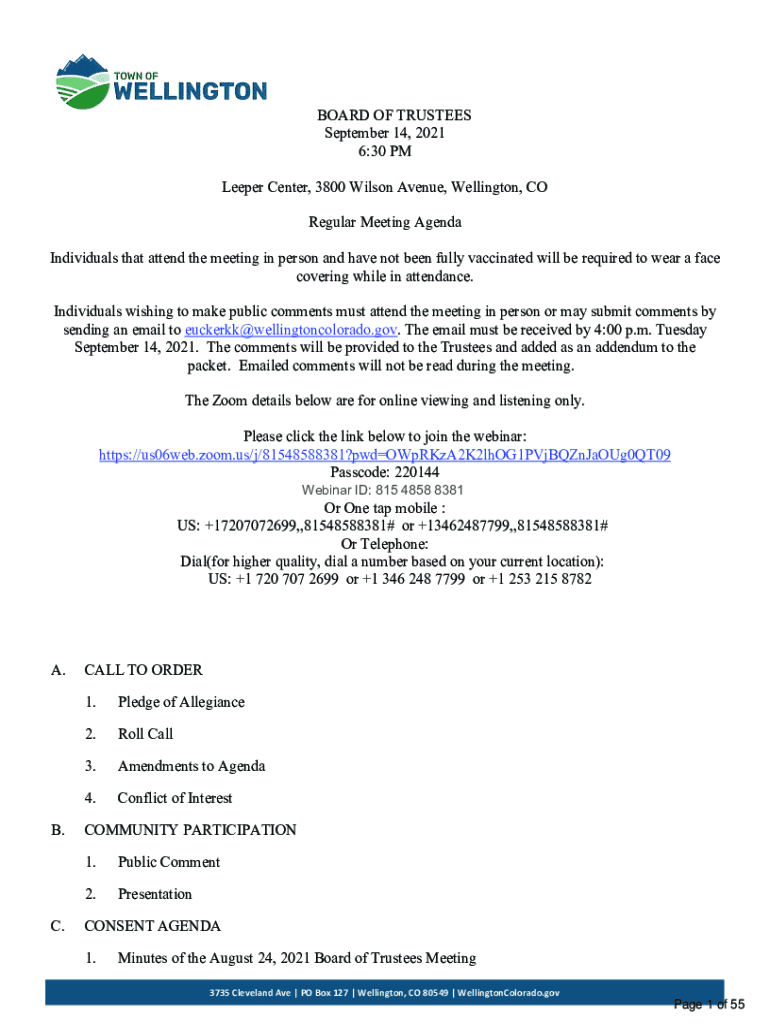 BOARD OF TRUSTEES September 14, 2021 6:30 PM Deeper Center, 3800 Wilson Avenue, Wellington, CO Regular Meeting Agenda Individuals that attend the meeting in person and have not been fully vaccinated