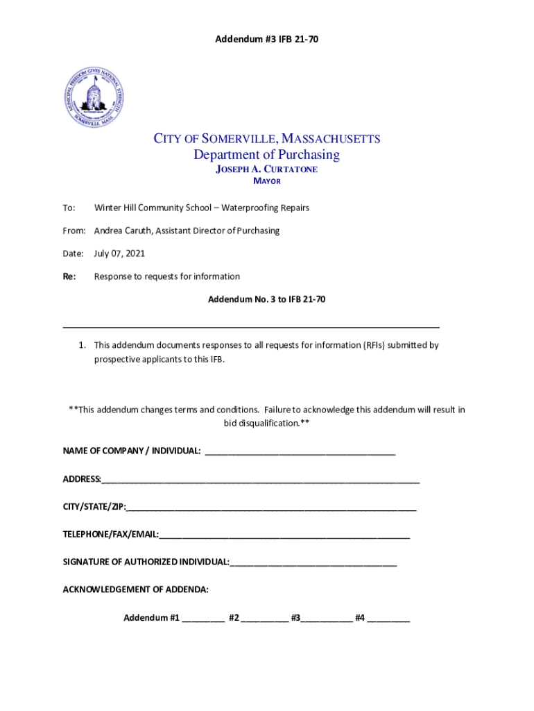 Addendum #3 IF 2170CITY OF SOMERVILLE, MASSACHUSETTS Department of Purchasing JOSEPH A. CURBSTONE MAYOR To:Winter Hill Community School Waterproofing RepairsFrom: Andrea Earth, Assistant Director