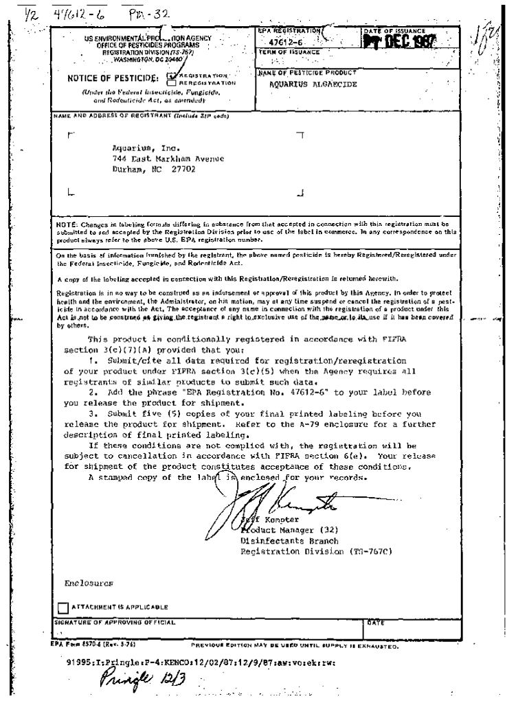 Us ENVIRONMENTAL×Lon AGENCY OFFICE OF PESTICIDES PROGRAMS REGISTRATION DIVISION (TS767×. \'. , WASHINGTON, DC 260\” NOTICE\'6F PESTICIDE, ::\'\'.\'RE.\” TR.\” O\”;: REREGISTRATIONAQUARIUS
