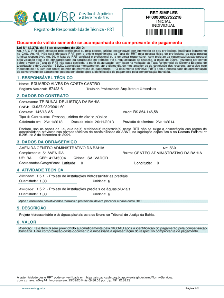 O formulário RRT Simples é um documento brasileiro utilizado por arquitetos e urbanistas para registrar seus serviços profissionais. Este formulário é fundamental para a legalização de projetos arquitetônicos, especialmente aqueles relacionados a obras hidrossanitárias e de águas pluviais. O uso do formulário RRT Simples é exigido por regulamentações específicas do Tribunal de Justiça da Bahia, destacando sua importância no contexto legal e profissional. Ao preencher este formulário, os profissionais garantem a conformidade legal de seus projetos, evitando complicações futuras.