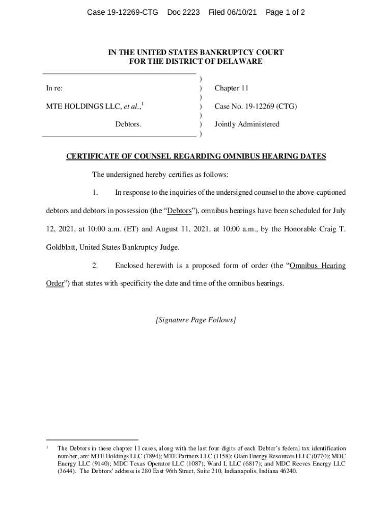 Case 1912269CTGDoc 2223Filed 06×10/21Page 1 of 2IN THE UNITED STATES BANKRUPTCY COURT FOR THE DISTRICT OF DELAWARE) In re:)) 1 ME HOLDINGS LLC, et al., ) ) Debtors. ) ___)Chapter 11 Case No. 1912269