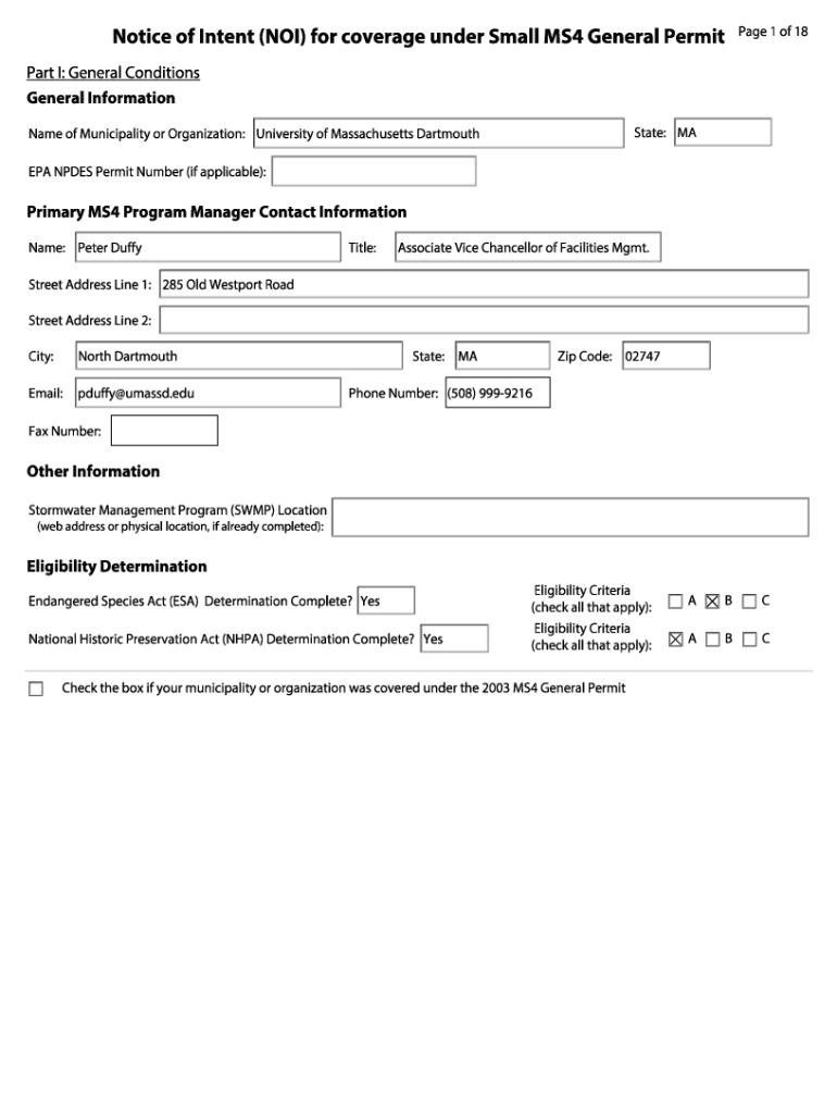 Notice of Intent (NOI) for coverage under Small MS4 General Permit Page 1 of 18Part I: General ConditionsGeneral Information Name of Municipality or Organization: University of Massachusetts DartmouthState: