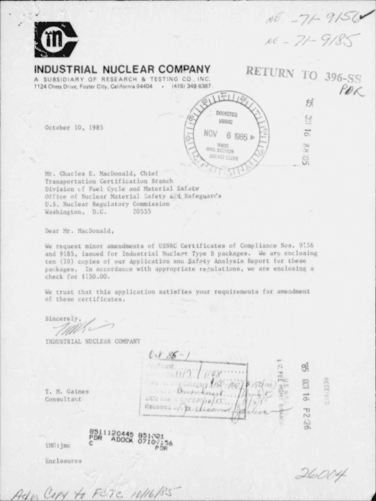 \” \'\'\', s g/ 9/SW.p y 94f. INDUSTRIAL NUCLEAR COMPANYRETURN TO 396Ss BA SUBSIDY ARY OF R ESE ARCH & TESTING CO., INC. 1124 Chess Drive, Foster City, California 94404(415) 349 6367.to \” Did
