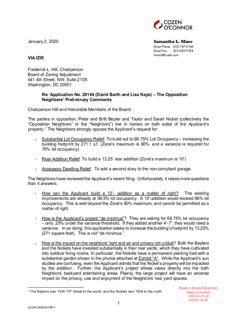 Samantha L. mid-January 2, 2020Direct Phone 2027470768 Direct Fax 2026839394 smaze×cozen.comic IRIS Frederick L. Hill, Chairperson Board of Zoning Adjustment 441 4th Street, NW, Suite 210S Washington,