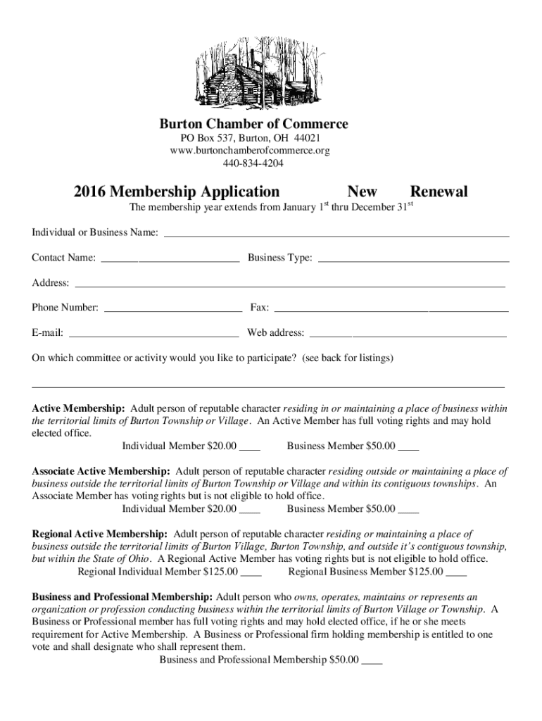 Burton Chamber of Commerce PO Box 537, Burton, OH 44021 www.burtonchamberofcommerce.org 44083442042016 Membership ApplicationNewRenewalThe membership year extends from January 1st through December