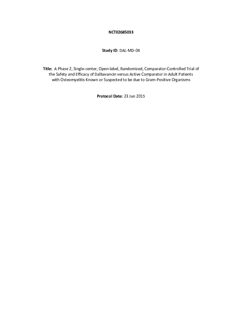 NCT02685033 Study ID:DALMD04 Title:APhase2,Single center, Open label, Randomized, ComparatorControlledTrialof theSafetyandEfficacyofDalbavancinversusActiveComparatorinAdultPatients withOsteomyelitisKnownorSuspectedtobeduetoGramPositiveOrganismsProtocolDate:23Jun2015Durata