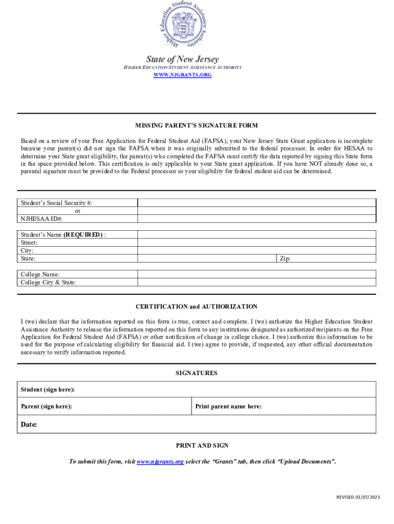 State of New Jersey HIGHER EDUCATION STUDENT ASSISTANCE AUTHORITY WWW.GRANTS.MISSING PARENTS SIGNATURE FORM Based on a review of your Free Application for Federal Student Aid (FAFSA×, your New Jersey