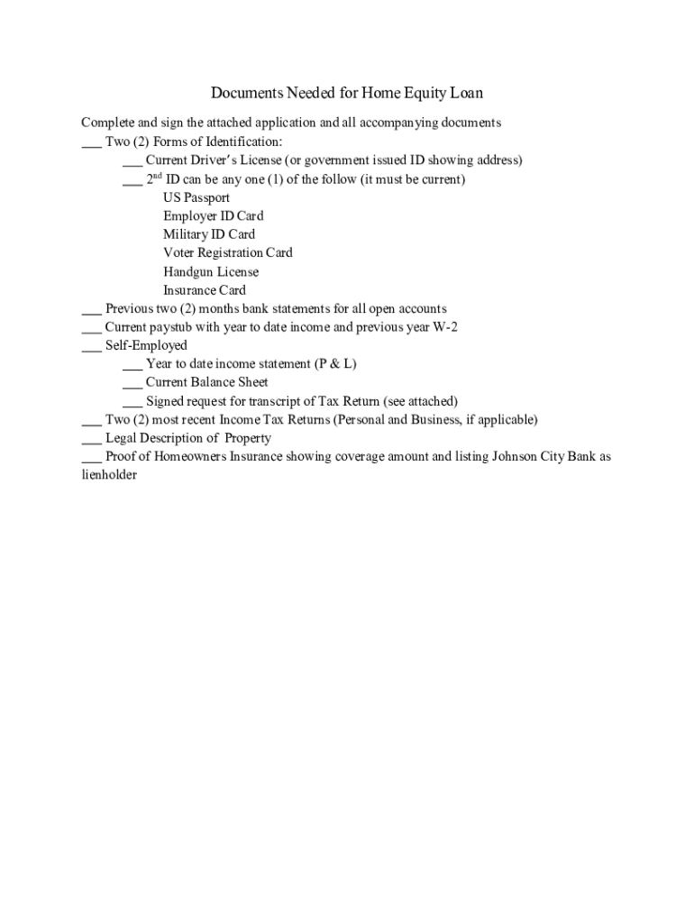 Documents Needed for Home Equity Loan Complete and sign the attached application and all accompanying documents Two (2) Forms of Identification: Current Driver's License (or government issued ID showing