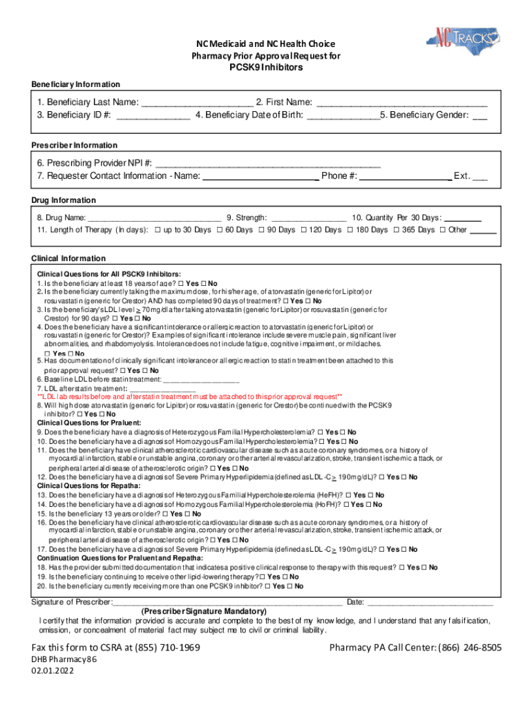 NC Medicaid and NC Health Choice Pharmacy Prior Approval Request for PCSK9 Inhibitors Beneficiary Inform ation1. Beneficiary Last Name: ___ 2. First Name: ___ 3. Beneficiary ID #: ___ 4. Beneficiary