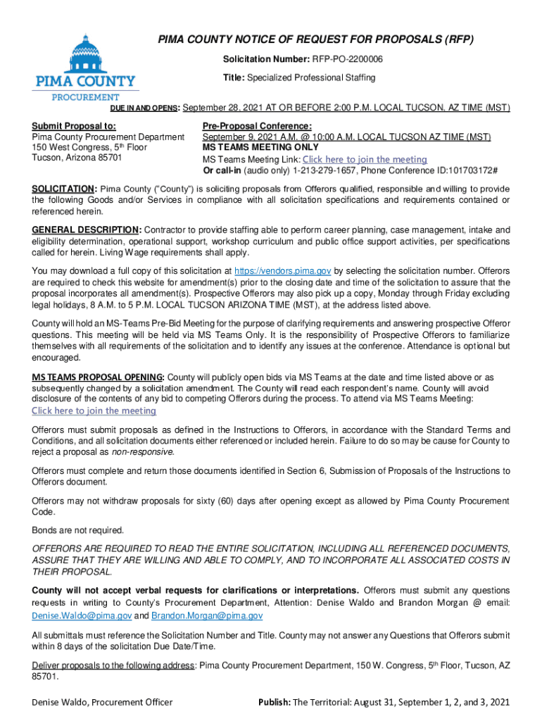 PIMA COUNTY NOTICE OF REQUEST FOR PROPOSALS (RFP) Solicitation Number: RFPPO2200006 Title: Specialized Professional Staffing DUE IN AND OPENS:September 28, 2021, AT OR BEFORE 2:00 P.M. LOCAL TUCSON,