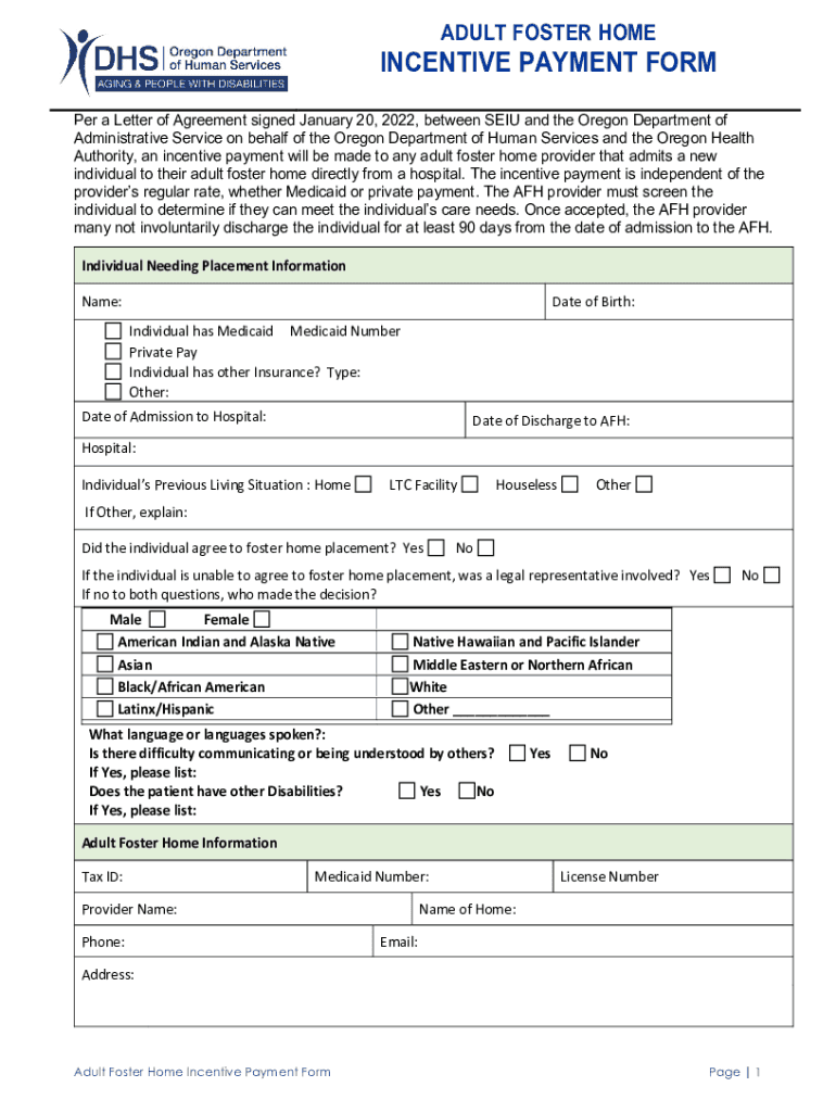 ADULT FOSTER HOMEINCENTIVE PAYMENT FORM Per a Letter of Agreement signed January 20, 2022, between SEU and the Oregon Department of Administrative Service on behalf of the Oregon Department of Human