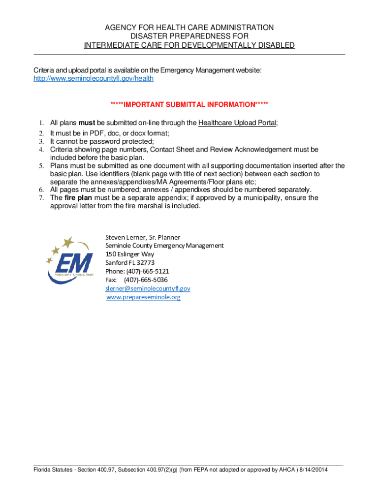 AGENCY FOR HEALTH CARE ADMINISTRATION DISASTER PREPAREDNESS FOR INTERMEDIATE CARE FOR DEVELOPMENTALLY DISABLED ___Criteria and upload portal is available on the Emergency Management website: HTTP://www.seminolecountyfl.gov×health*****IMPORTANT