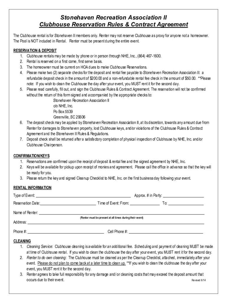 Stone haven Recreation Association II Clubhouse Reservation Rules & Contract Agreement The Clubhouse rental is for Stone haven II members only. Renter may not reserve Clubhouse as proxy for anyone
