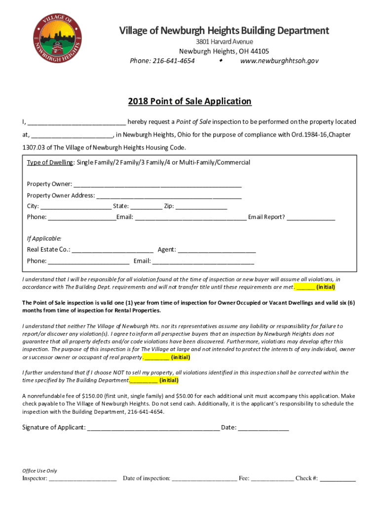 Village of Newburgh Heights Building Department 3801 Harvard Avenue Newburgh Heights, OH 44105 Phone: 2166414654 www.newburghhtsoh.gov2018 Point of Sale Application I, ___ hereby request a Point of