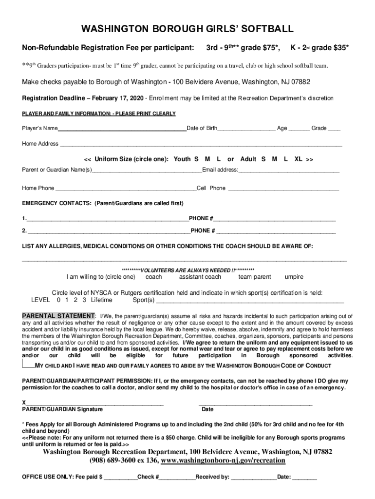 WASHINGTON BOROUGH GIRLS SOFTBALL NonRefundable Registration Fee per participant:3rd 9th** grade $75×, K 2 grade $35* ND**9th Graders' participation must be 1st time 9th grader, cannot be participating