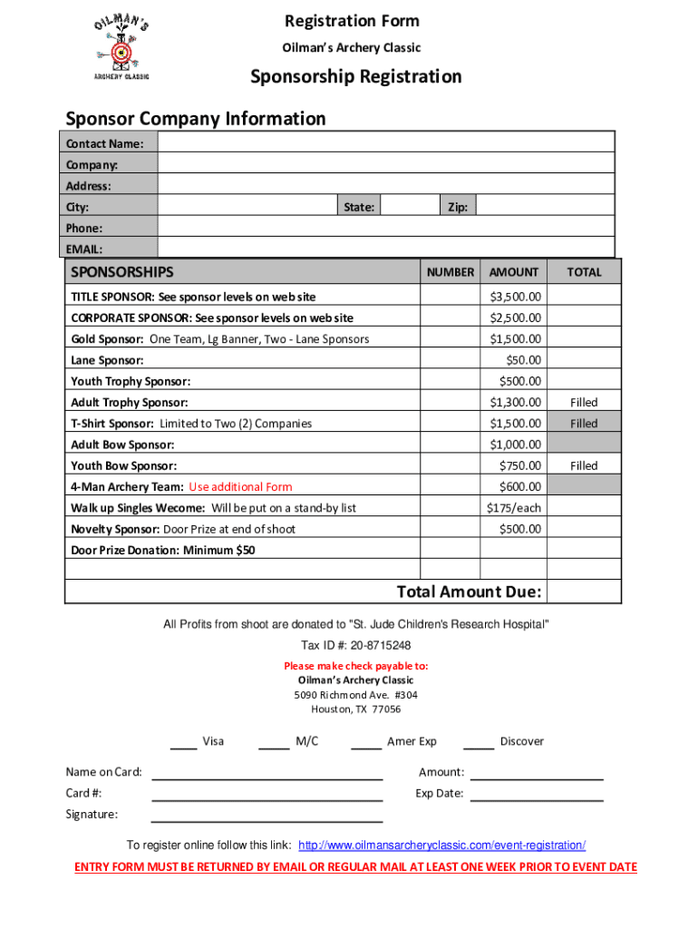 Registration Form Oilman Archery ClassicSponsorship Registration Sponsor Company Information Contact Name: Company: Address: City:State:Zip:Phone: EMAIL:SPONSORSHIPSNUMBERAMOUNTTITLE SPONSOR: See