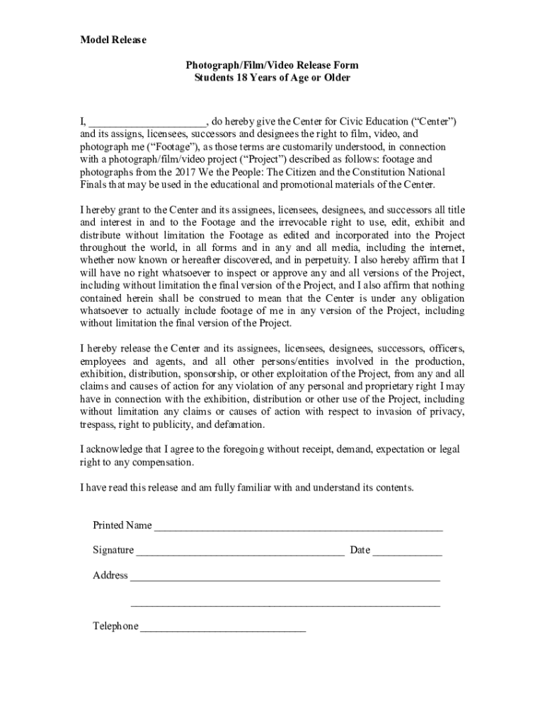 Model Release Photograph×Film×Video Release Form Students 18 Years of Age or Older I, ___, do hereby give the Center for Civic Education (Center) and its assigns, licensees, successors and designees