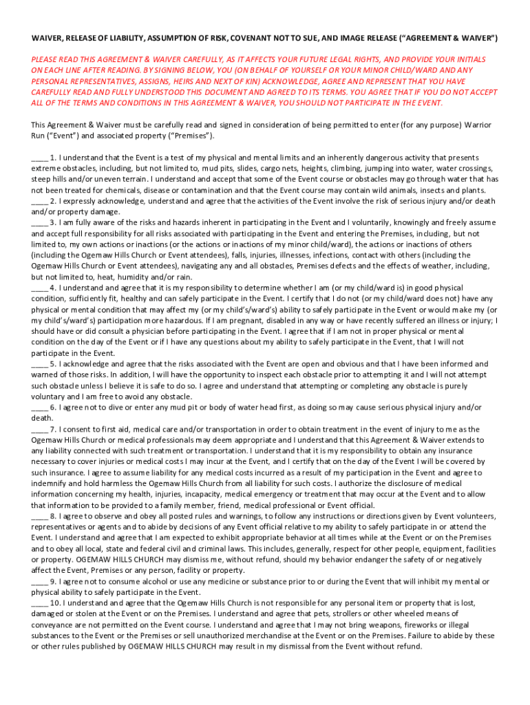 WAIVER, RELEASE OF LIABILITY, ASSUMPTION OF RISK, COVENANT NOT TO SUE, AND IMAGE RELEASE (AGREEMENT & WAIVER) PLEASE READ THIS AGREEMENT & WAIVER CAREFULLY, AS IT AFFECTS YOUR FUTURE LEGAL RIGHTS,
