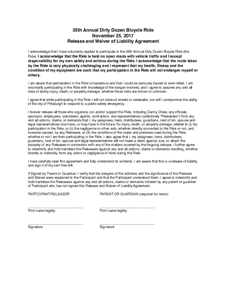 35th Annual Dirty Dozen Bicycle Ride November 25, 2017, Release and Waiver of Liability Agreement I acknowledge that I have voluntarily applied to participate in the 35th Annual Dirty Dozen Bicycle