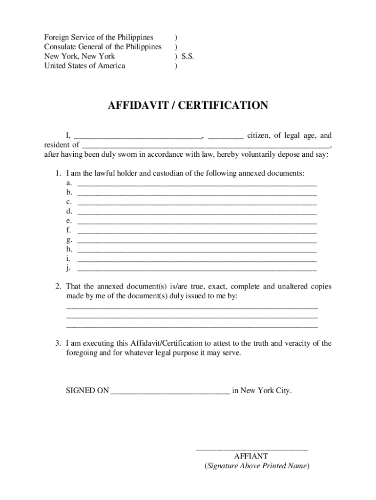 Foreign Service of the Philippines Consulate General of the Philippines New York, New York United States of America))) S.S.)AFFIDAVIT / CERTIFICATION I, ___, ___ citizen, of legal age, and resident