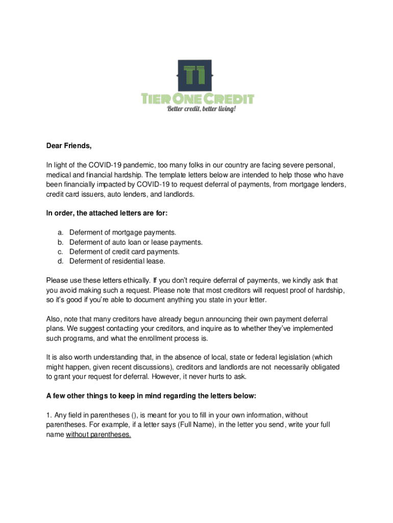 Dear Friends, In light of the COVID-19 pandemic, too many folks in our country are facing severe personal, medical and financial hardship. The template letters below are intended to help those who