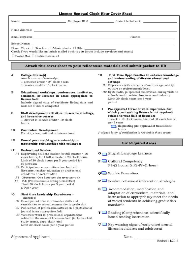License Renewal Clock Hour Cover Sheet Name:Employee ID #:State File Folder #:Home Address: Email required: ___Phone: ___ School Name:___Please Check: Teacher Administrator Other___ Check if you would