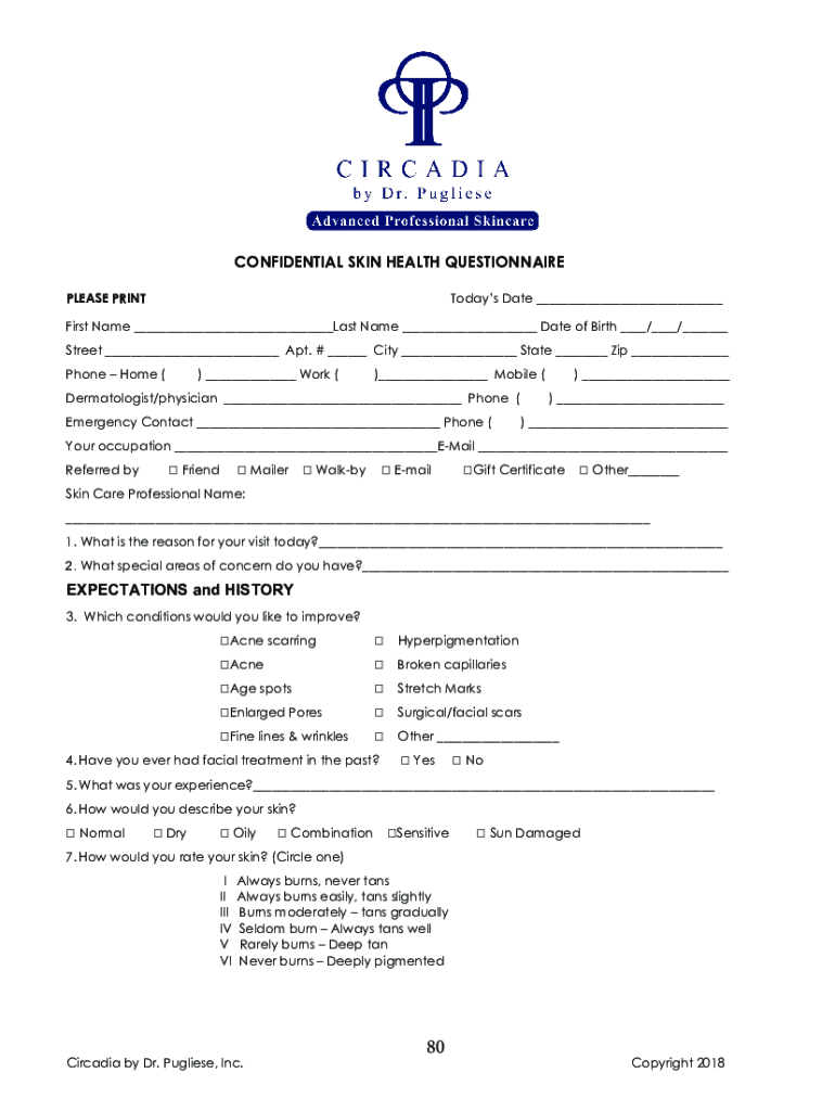 CONFIDENTIAL SKIN HEALTH QUESTIONNAIRE PLEASE PRINTTodays Date ___First Name ___Last Name ___ Date of Birth ___/___/___ Street ___ Apt. # ___ City ___ State ___ Zip ___ Phone Home () ___ Work ()___