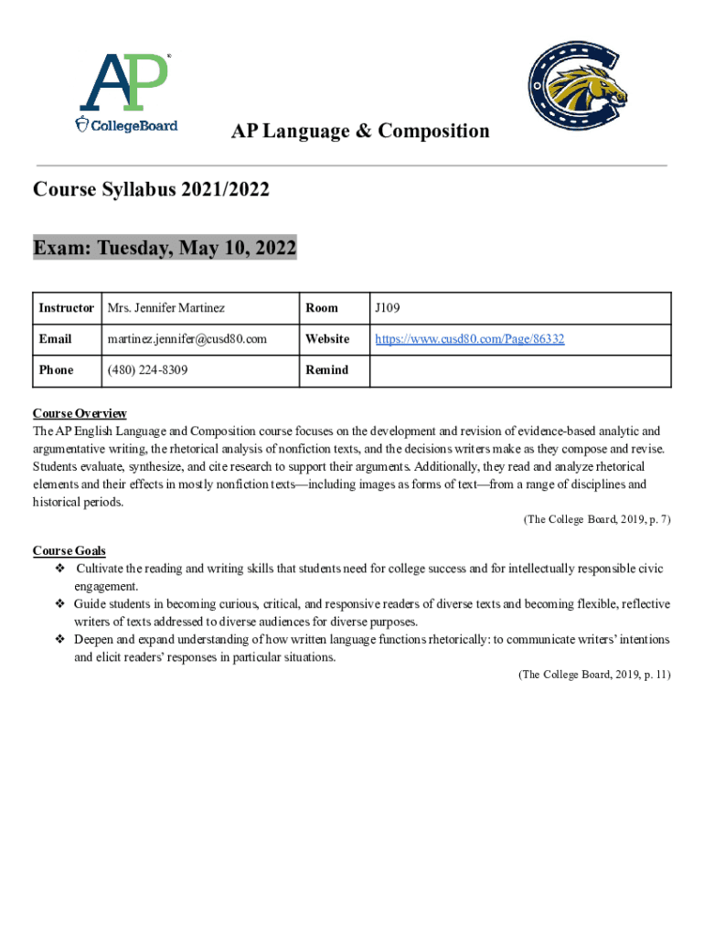 AP Language & Composition Course Syllabus 2021×2022 Exam: Tuesday, May 10, 2022, Instructor Mrs. Jennifer MartinezRoomJ109Emailmartinez. Jennifer×cusd80.comWebsitehttps://www.cusd80.com×Page×86332Phone×480)