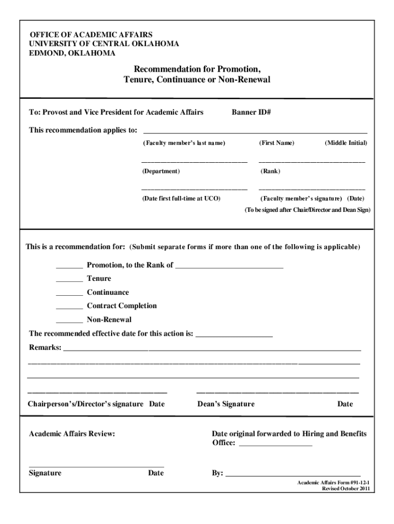 OFFICE OF ACADEMIC AFFAIRS UNIVERSITY OF CENTRAL OKLAHOMA EDMOND, OKLAHOMARecommendation for Promotion, Tenure, Continuance or Nonrenewable: Provost and Vice President for Academic AffairsBanner ID×This