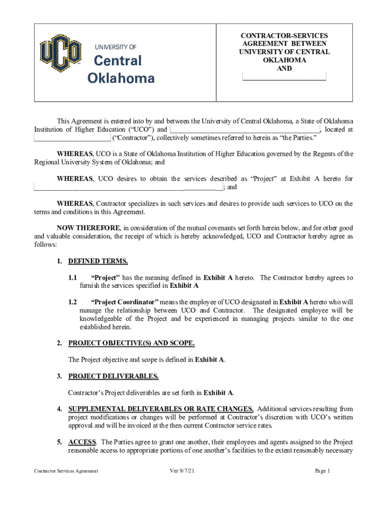 CONTRACTORSERVICES AGREEMENT BETWEEN UNIVERSITY OF CENTRAL OKLAHOMA AND ___UNIVERSITY OF Central OklahomaThis Agreement is entered into by and between the University of Central Oklahoma, a State of