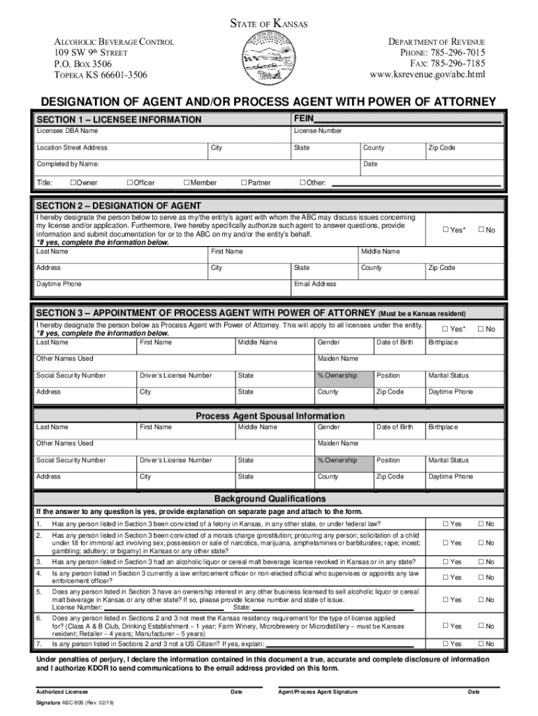 STATE OF KANSAS ALCOHOLIC BEVERAGE CONTROL 109 SW 9th STREET P.O. BOX 3506 TOPEKA KS 666013506DEPARTMENT OF REVENUE PHONE: 7852967015 FAX: 7852967185 www.ksrevenue.gov×ABC.htmlDesignation of Agent