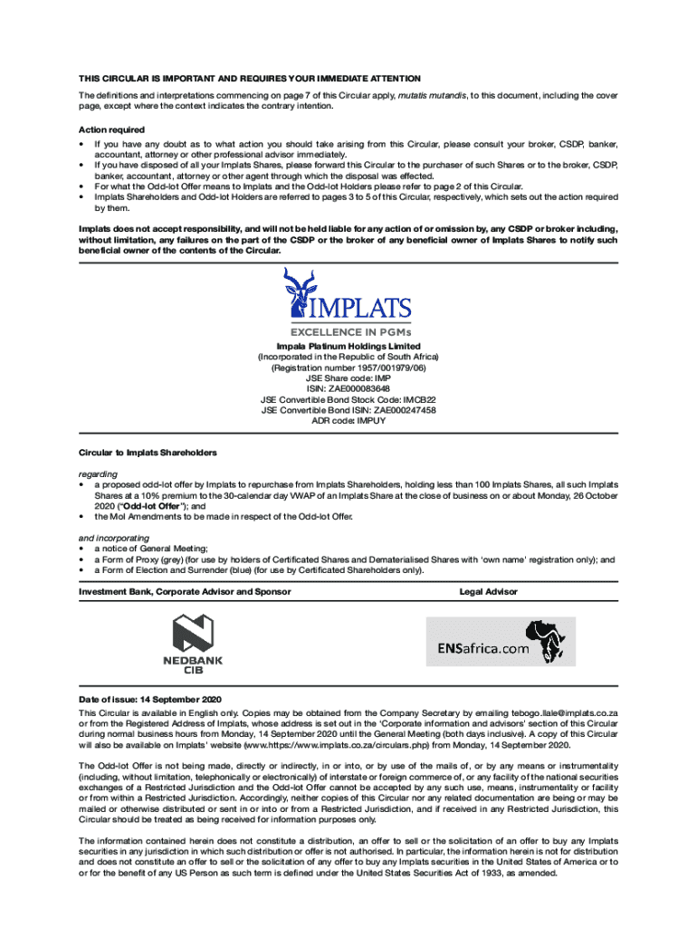 THIS CIRCULAR IS IMPORTANT AND REQUIRES YOUR IMMEDIATE ATTENTION The definitions and interpretations commencing on page 7 of this Circular apply, mutatis mutandis, to this document, including the