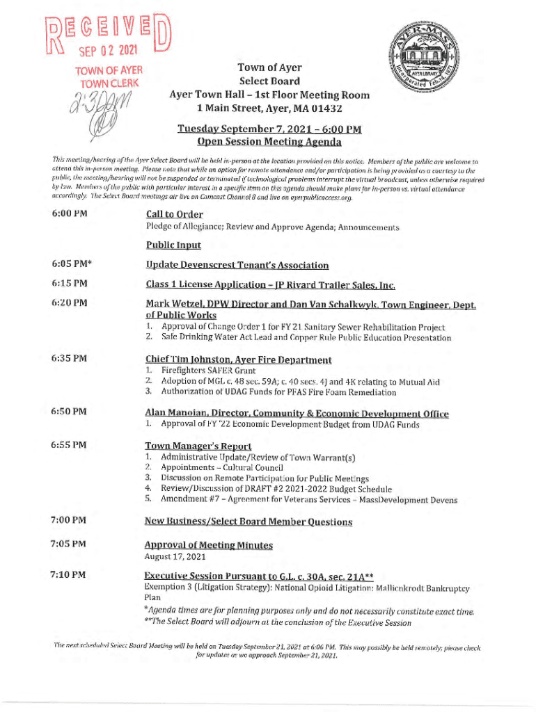 Get the free www.ayer.ma.ussitesgTOWN OF AYER Town of Ayer TOWN CLERK Select Board