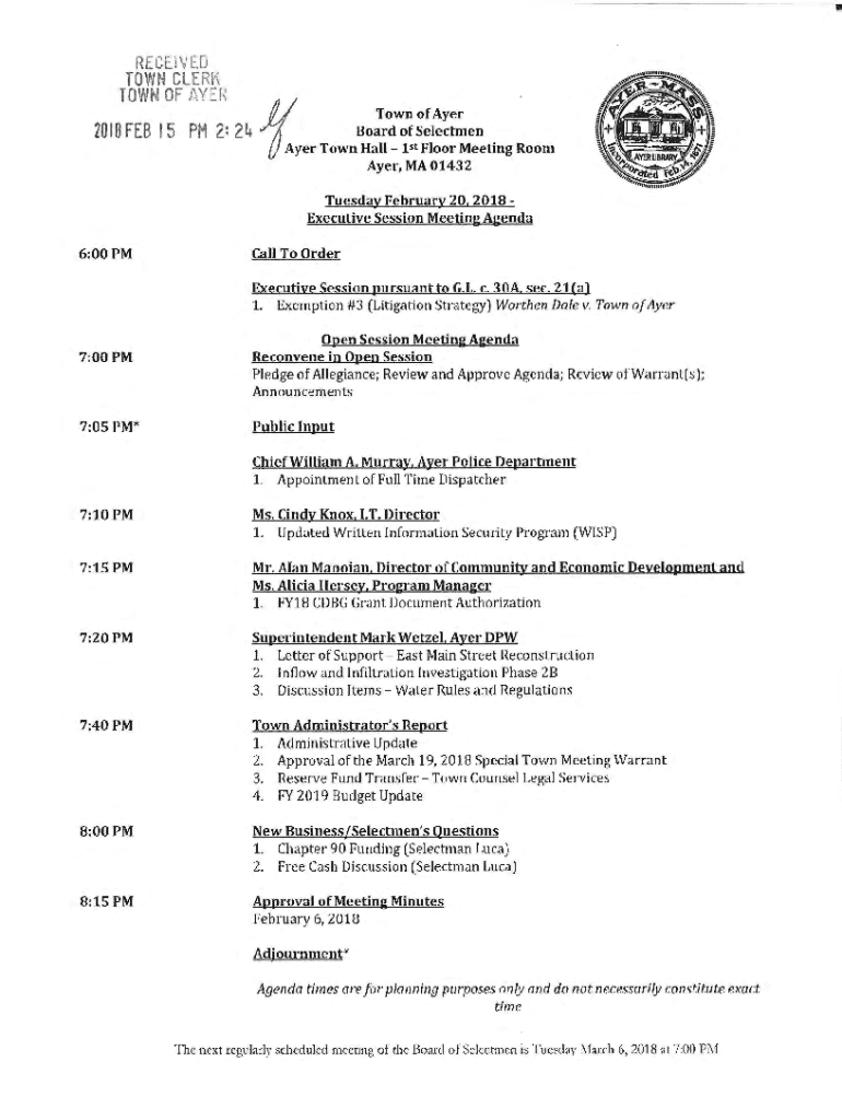 Received TOW N Clear TOW N OF AYERS 18 FEB 15 PM 2: 24t. Town of Layer Board of Selectmen yer Town Hall t st Floor Meeting Room Layer, MA 01432 Tuesday, February 20. 2018 Executive Session Meeting