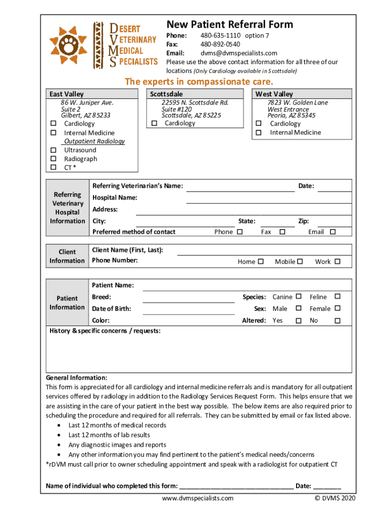 New Patient Referral Hormone: 4806351110 option 7 Fax: 4808920540 Email: DVMs×dvmspecialists.com Please use the above contact information for all three of our locations (Only Cardiology available