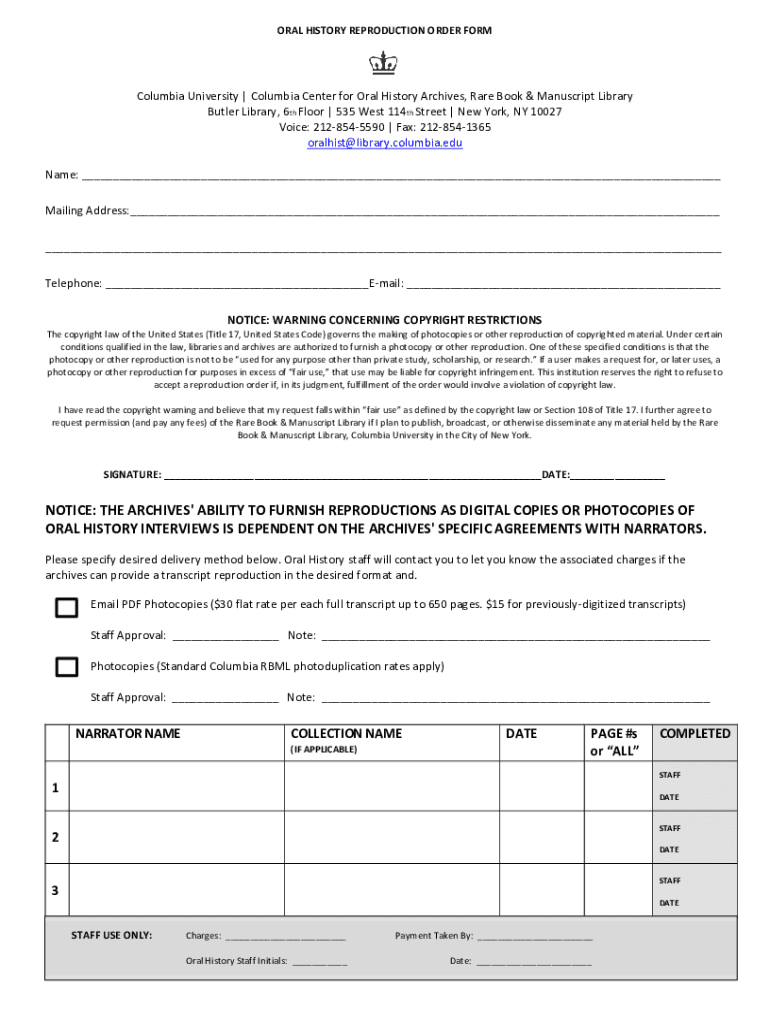 ORAL HISTORY REPRODUCTION ORDER FORM Columbia University | Columbia Center for Oral History Archives, Rare Book & Manuscript Library Butler Library, 6th Floor | 535 West 114th Street | New York, NY