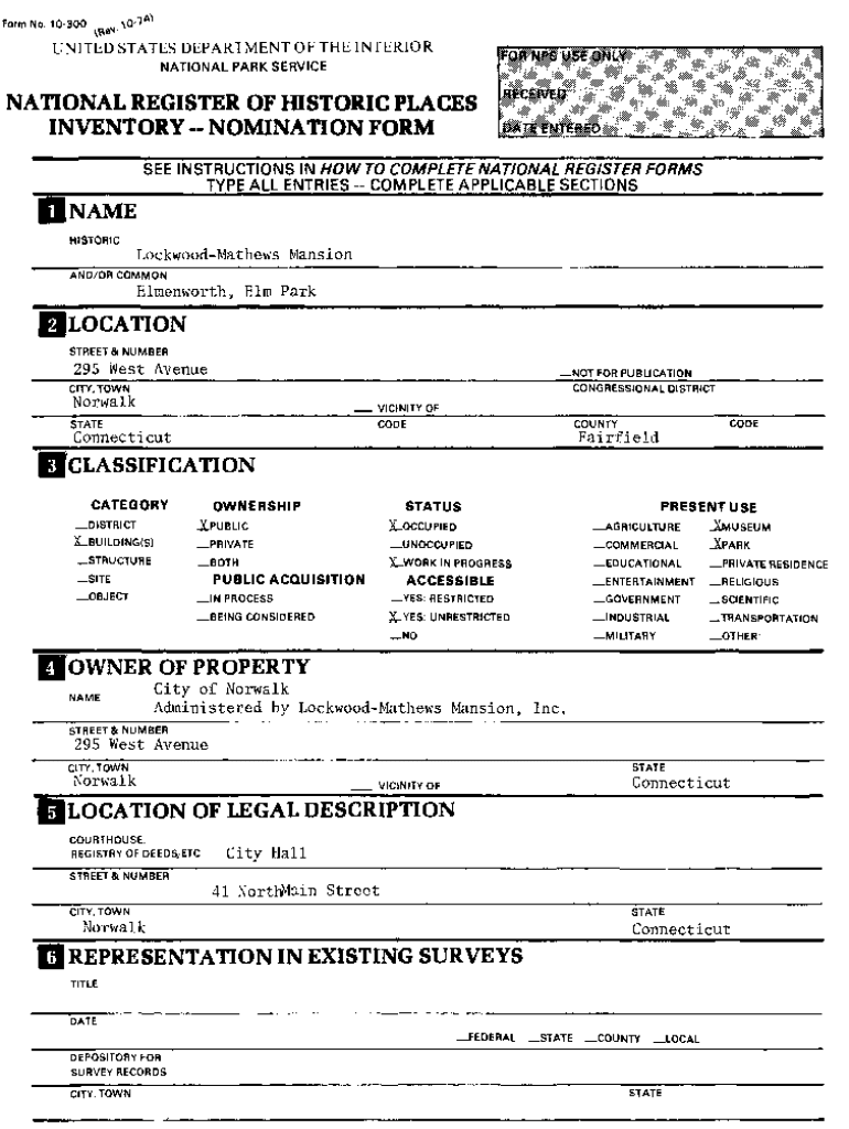 Form No. 10300 *, 01UNITED STATES DEPARTMENT OF THE INTERIOR NATIONAL PARK SERVICENATIONAL REGISTER OF HISTORIC PLACES INVENTORY NOMINATION FORM SEE INSTRUCTIONS IN HO WTO COMPLETE NATIONAL REGISTER