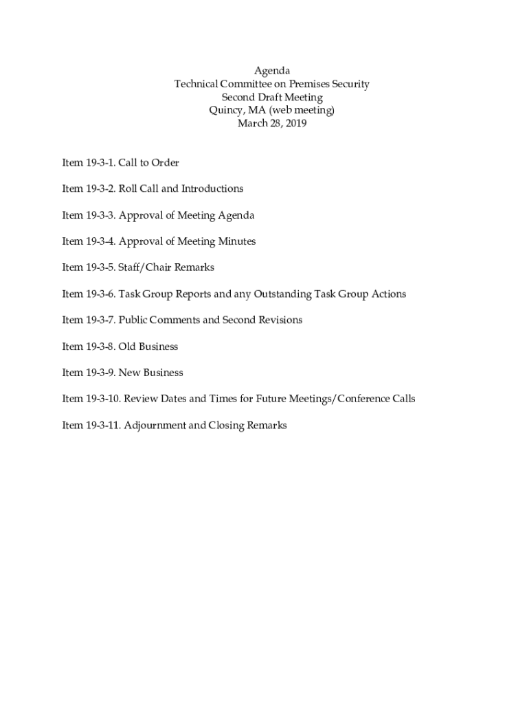 Agenda Technical Committee on Premises Security Second Draft Meeting Quincy, MA (web meeting) March 28, 2019, Item 1931. Call to Order Item 1932. Roll Call and Introductions Item 1933. Approval of
